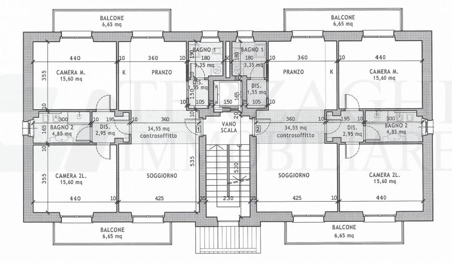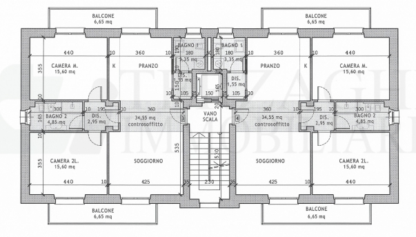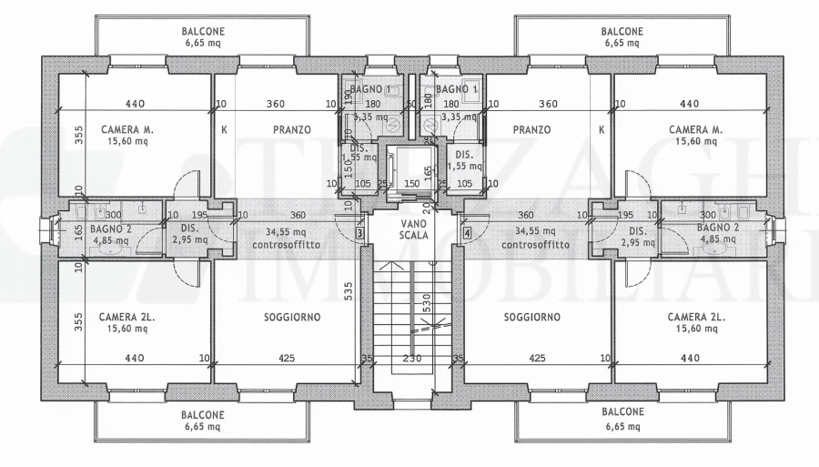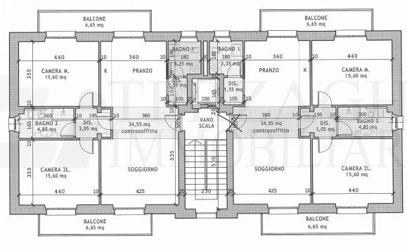 Ciascun alloggio, isolato acusticamente dagli altri, di superficie pari a 90 mq ca. è composto di ingresso linving in ampio soggiorno, cucina, due camere da letto matrimoniali, doppio bagno e doppio balcone. Al piano terra cantina, posto auto riservato e box auto.